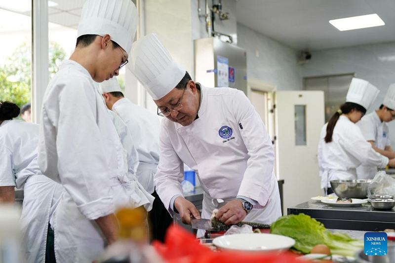 A teacher (R) instructs a student on making Sichuan cuisine at Sichuan Tourism University in Chengdu, Southwest China's Sichuan province, April 24, 2025. [Xinhua/Xu Bingjie]