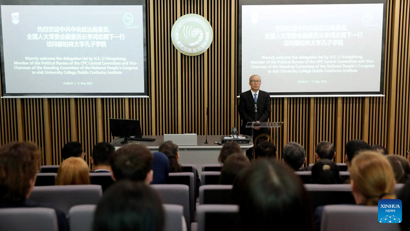 Li Hongzhong, a member of the Political Bureau of the Communist Party of China Central Committee and vice-chairman of China's National People's Congress Standing Committee, holds discussions with teachers and students from the Confucius Institute at University College Dublin in Dublin, Ireland, May 15, 2025.